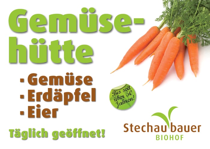 Direkt an unserer Hofzufahrt befindet sich unsere Gemüsehütte mit einem Selbstbedienungsautomaten für Gemüse, Erdäpfel, Eier und ein gekühlter Automat für Fleisch.