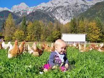 Hühner sind gerne und viel im Freien, lieben Staub- und Sonnenbäder und zupfen gerne an frischem Grün. Der Hühnerstall lässt sich mit Hilfe eines Traktors ganz einfach überstellen. Das bedeutet, dass wir unseren Hühnern stets eine frische Weide anbieten können. Da die Hühner mehrmals im Monat eine neue Weide mit saftigem Grün bekommen, vermeiden wir Schlammbildung im Auslauf, die Parasitenvermehrung und überdüngte Flächen. Die „mobile“ Freilandhaltung wirkt sich somit nicht nur positiv auf die Gesundheit der Hühner aus sondern auch auf die Eiqualität. Die Hühner legen viele besonders schmackhafte Eier mit intensiv gelbem Dotter.